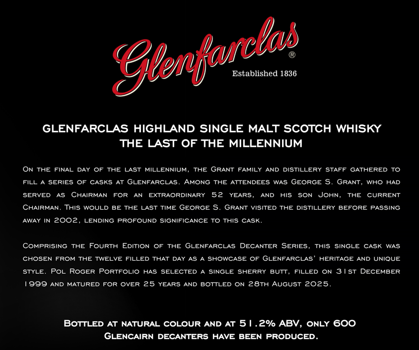 COMPRISING THE FOURTH EDITION OF THE GLENFARCLAS DECANTER SERIES, THIS SINGLE CASK WAS CHOSEN FROM THE TWELVE FILLED THAT DAY AS A SHOWCASE OF GLENFARCLAS' HERITAGE AND UNIQUE STYLE. POL ROGER PORTFOLIO HAS SELECTED A SINGLE SHERRY BUTT, FILLED ON 3 I ST DECEMBER 1999 AND MATURED FOR OVER 25 YEARS AND BOTTLED ON 28TH AUGUST 2025.